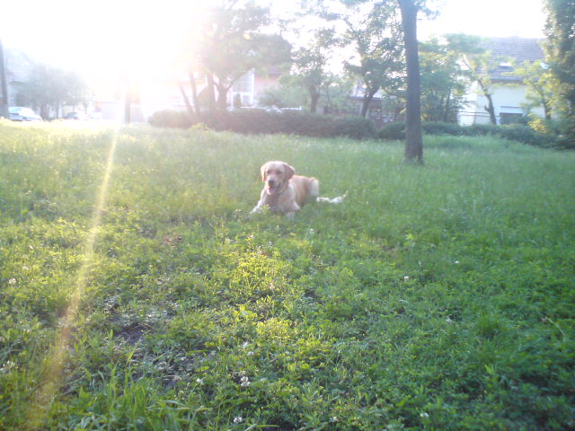 Gyakoroltunk. A helyben maradásnál most igazán ügyi volt. Mikor odaérek hozzá nincs egyből dicséret, és nem állhat fel. Fekszik tovább, néz rám, aztán vagy megpaskolom a lábam, vagy a lábam mellé csettintek és közben mondom neki, hogy "ül". Akkor felül, és nagy nagy örömködés :) A láb mellett követés 1x ilyen 1x olyan volt. Ezt a lököttségét a melegnek kéne betudnom? Már nem is értem.