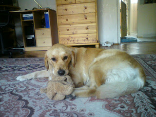 "Tesó" : egy plüsskutya, amit akkor kapott, mikor hoztuk haza a tenyésztőjétől. Igaz, hogy az egyik füle leszakadt (amit megtartottunk), emellett nagyon vigyáz rá. Tépi, mint a többi játékát, de nem anniyra durván. Ez a kedvence. Ő a Tesója :)